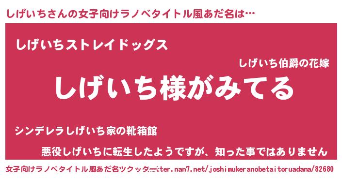 | 男性向けラノベタイトル風あだ名 | 『しげいちの嫁は女の子じゃないと思った?』 |
