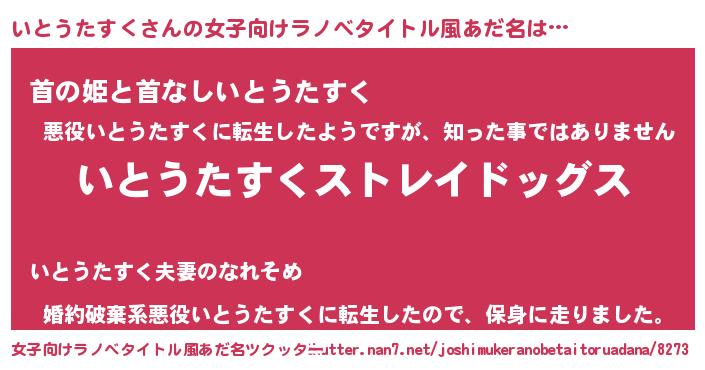 | 男性向けラノベタイトル風あだ名 | 『Re:いとうたすくから始める異世界生活』 |
