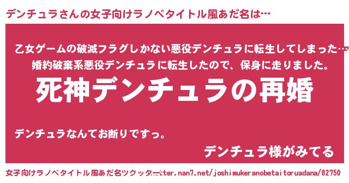 | 男性向けラノベタイトル風あだ名 | 『ノーゲーム・ノーデンチュラ』 |