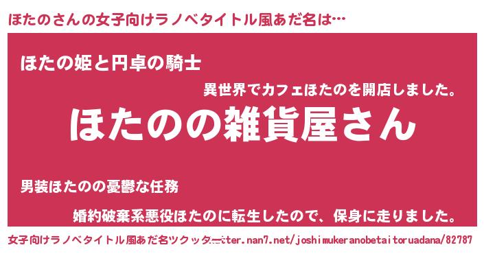 ほたのさんの女子向けラノベタイトル風あだ名は… 『ほたのの雑貨屋さん』『ほたの姫と円卓の騎士』『婚約破棄系悪役ほたのに転生したので、保身に走りました。』 ツクッター #女子向けラノベタイトル風あだ名ツクッター http://tkutter.nan7.net/joshimukeranobetaitoruadana/82787/