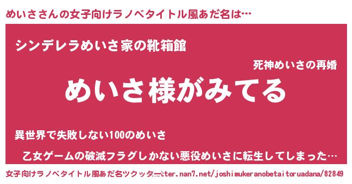 | 男性向けラノベタイトル風あだ名 | 『めいさの嫁は女の子じゃないと思った?』 |