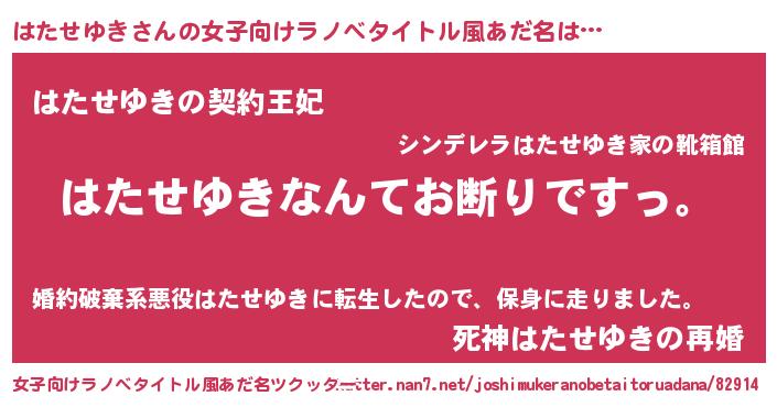 | ヘコむあだ名 | 『はたせゆき(苦笑)』『はたっぺ』 |