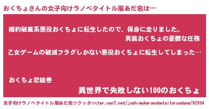 | 男性向けラノベタイトル風あだ名 | 『魔弾の王とおくちょ』 |