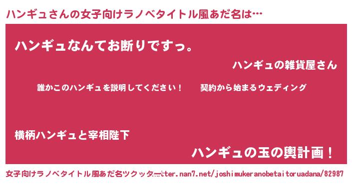 ハンギュさんの女子向けラノベタイトル風あだ名は… 『誰かこのハンギュを説明してください! ~契約から始まるウェディング~』『ハンギュなんてお断りですっ。』『ハンギュの玉の輿計画!』 ツクッター #女子向けラノベタイトル風あだ名ツクッター http://tkutter.nan7.net/joshimukeranobetaitoruadana/82987/