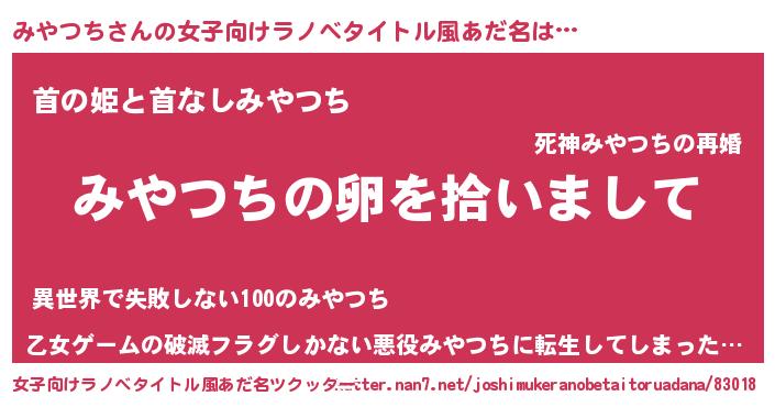 | 男性向けラノベタイトル風あだ名 | 『ダンジョンにみやつちを求めるのは間違っているだろうか』 |
