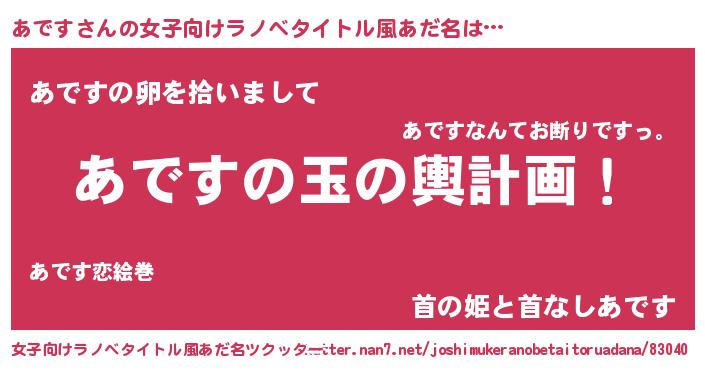 | 男性向けラノベタイトル風あだ名 | 『あです~年齢イコール彼女いない歴の魔法使い~』 |