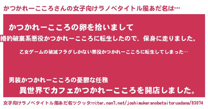| 男性向けラノベタイトル風あだ名 | 『この素晴らしい世界にかつかれーこころを!』 |