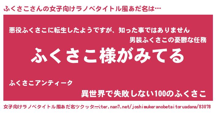 | 男性向けラノベタイトル風あだ名 | 『ふくさこの嫁は女の子じゃないと思った?』 |
