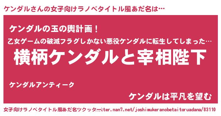 | 男性向けラノベタイトル風あだ名 | 『ケンダルに滅ぼされるだけの簡単なお仕事です』 |