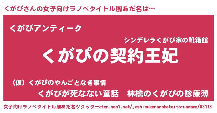 | 男性向けラノベタイトル風あだ名 | 『くがぴという概念が存在しない退屈な世界 』 |