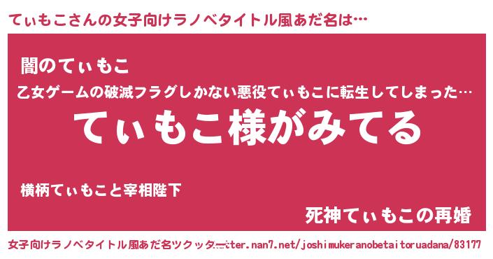 | 男性向けラノベタイトル風あだ名 | 『てぃもこの嫁は女の子じゃないと思った?』 |