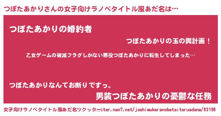| 男性向けラノベタイトル風あだ名 | 『魔弾の王とつぼたあかり』 |