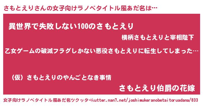 さもとえりさんの女子向けラノベタイトル風あだ名は… 『乙女ゲームの破滅フラグしかない悪役さもとえりに転生してしまった…』『異世界で失敗しない100のさもとえり』『さもとえり伯爵の花嫁』 ツクッター #女子向けラノベタイトル風あだ名ツクッター http://tkutter.nan7.net/joshimukeranobetaitoruadana/833/