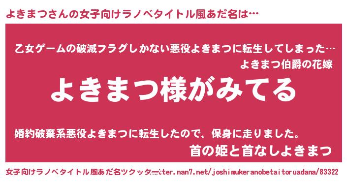 | 男性向けラノベタイトル風あだ名 | 『よきまつの嫁は女の子じゃないと思った?』 |