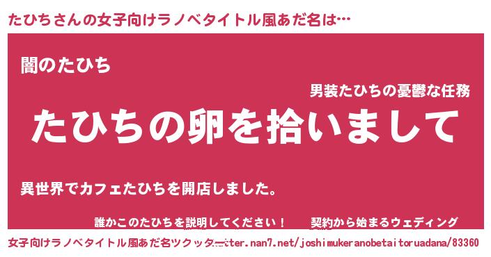 | 男性向けラノベタイトル風あだ名 | 『たひちの嫁は女の子じゃないと思った?』 |