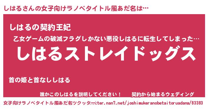 | 男性向けラノベタイトル風あだ名 | 『Re:しはるから始める異世界生活』 |