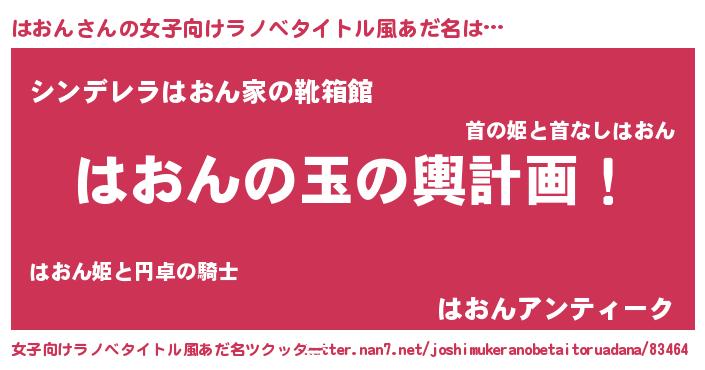 | 男性向けラノベタイトル風あだ名 | 『はおん~年齢イコール彼女いない歴の魔法使い~』 |
