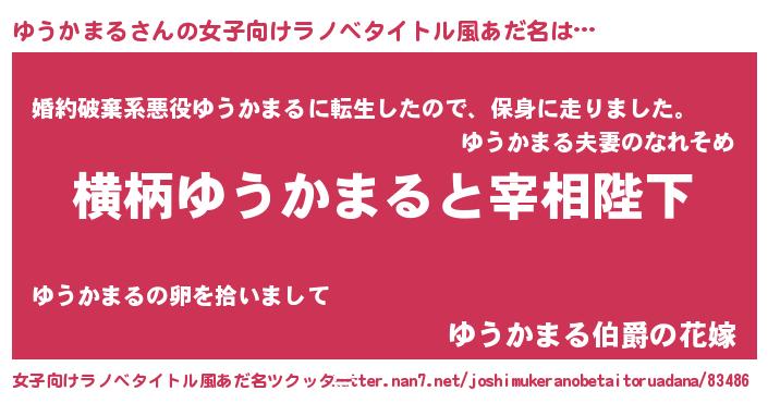 | 男性向けラノベタイトル風あだ名 | 『ゆうかまるに滅ぼされるだけの簡単なお仕事です』 |