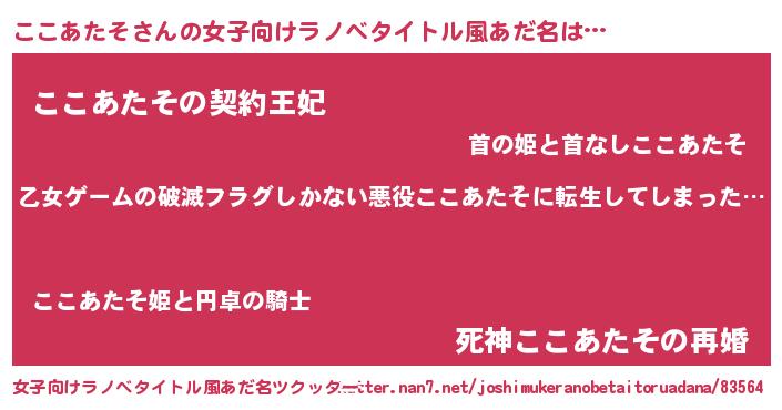 | 男性向けラノベタイトル風あだ名 | 『この素晴らしい世界にここあたそを!』 |
