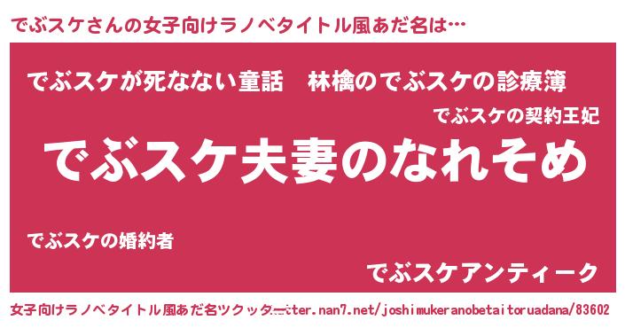 | 男性向けラノベタイトル風あだ名 | 『おまえをオタクにしてやるから、俺をでぶスケにしてくれ! 』 |