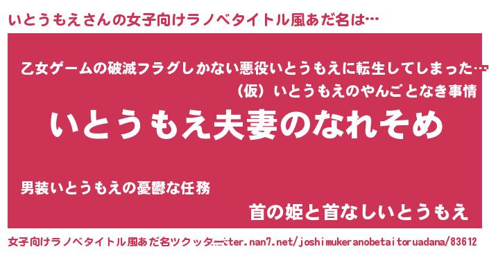 | 男性向けラノベタイトル風あだ名 | 『おまえをオタクにしてやるから、俺をいとうもえにしてくれ! 』 |