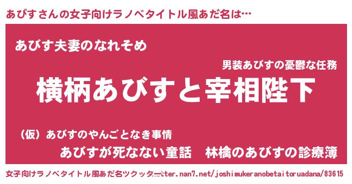 | 男性向けラノベタイトル風あだ名 | 『あびすに滅ぼされるだけの簡単なお仕事です』 |