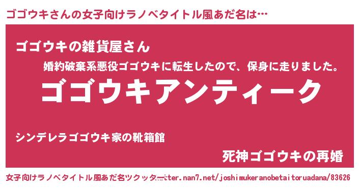 ゴゴウキさんの女子向けラノベタイトル風あだ名は… 『ゴゴウキアンティーク』『ゴゴウキの雑貨屋さん』『死神ゴゴウキの再婚』 ツクッター #女子向けラノベタイトル風あだ名ツクッター http://tkutter.nan7.net/joshimukeranobetaitoruadana/83626/