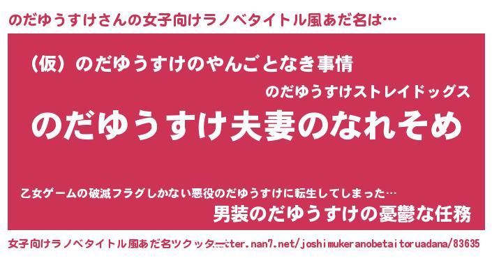 | 男性向けラノベタイトル風あだ名 | 『おまえをオタクにしてやるから、俺をのだゆうすけにしてくれ! 』 |