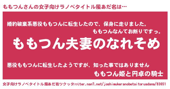 | 男性向けラノベタイトル風あだ名 | 『おまえをオタクにしてやるから、俺をももつんにしてくれ! 』 |