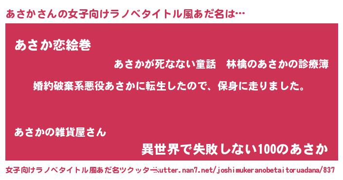 | 男性向けラノベタイトル風あだ名 | 『転生したらあさかだった件』 |