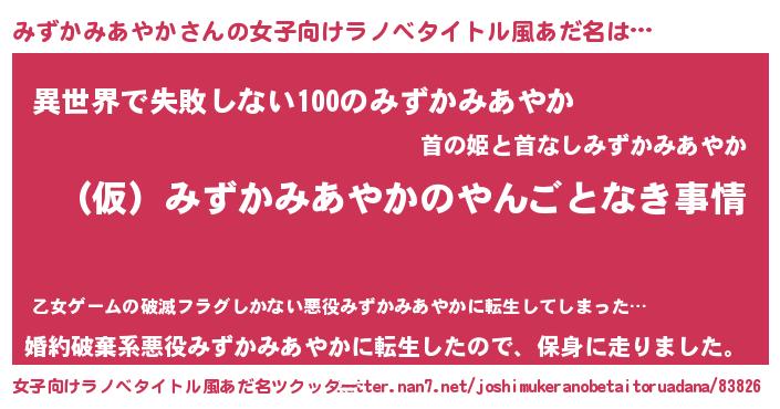 | 男性向けラノベタイトル風あだ名 | 『みずかみあやかの憂鬱』 |