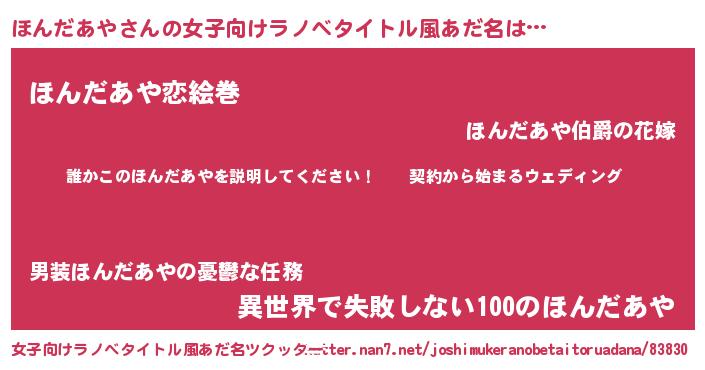 | 男性向けラノベタイトル風あだ名 | 『ホンダアヤアートオンライン』 |