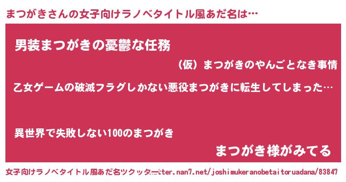| 男性向けラノベタイトル風あだ名 | 『この素晴らしい世界にまつがきを!』 |
