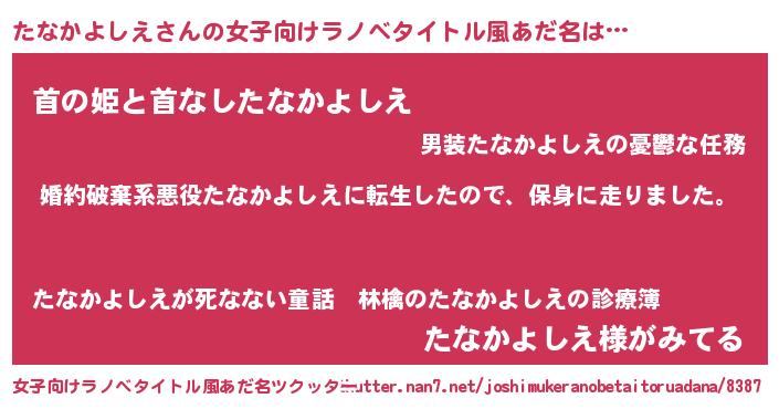 たなかよしえさんの女子向けラノベタイトル風あだ名は… 『婚約破棄系悪役たなかよしえに転生したので、保身に走りました。』『首の姫と首なしたなかよしえ』『たなかよしえ様がみてる』 ツクッター #女子向けラノベタイトル風あだ名ツクッター http://tkutter.nan7.net/joshimukeranobetaitoruadana/8387/