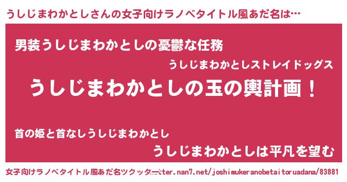 うしじまわかとしさんの女子向けラノベタイトル風あだ名は… 『うしじまわかとしの玉の輿計画!』『男装うしじまわかとしの憂鬱な任務』『うしじまわかとしは平凡を望む』 ツクッター #女子向けラノベタイトル風あだ名ツクッター http://tkutter.nan7.net/joshimukeranobetaitoruadana/83881/