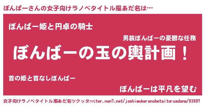 | 男性向けラノベタイトル風あだ名 | 『ぼんばー~年齢イコール彼女いない歴の魔法使い~』 |