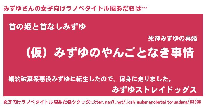 | 男性向けラノベタイトル風あだ名 | 『みずゆの憂鬱』『はたらくみずゆさま!』 |