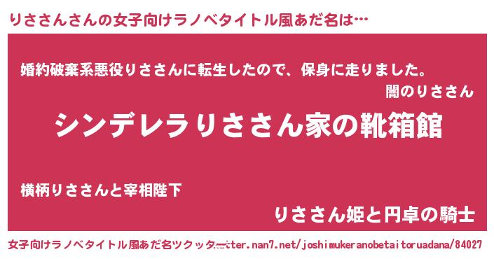 | 男性向けラノベタイトル風あだ名 | 『緋弾のリササン』『りささんの憂鬱』 |