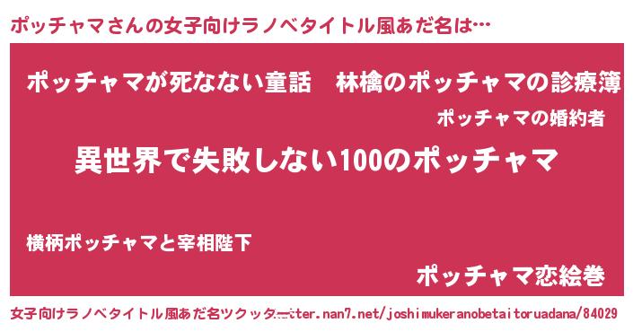 | 男性向けラノベタイトル風あだ名 | 『ポッチャマという概念が存在しない退屈な世界 』 |