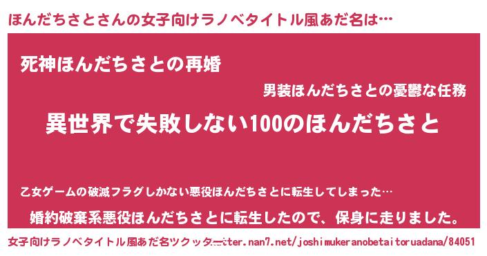 | 男性向けラノベタイトル風あだ名 | 『ほんだちさとという概念が存在しない退屈な世界 』 |