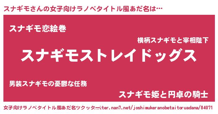 | 男性向けラノベタイトル風あだ名 | 『Re:スナギモから始める異世界生活』 |