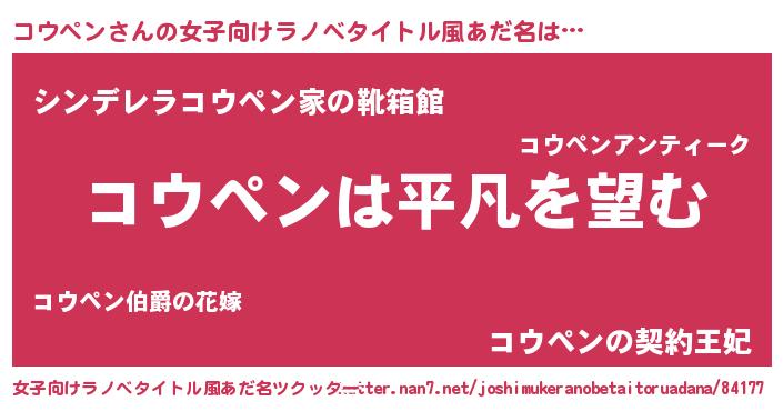 | 男性向けラノベタイトル風あだ名 | 『ダンジョンにコウペンを求めるのは間違っているだろうか』 |