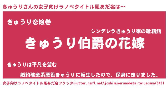 | ヒーロー風カッコイイあだ名 | 『ウルトラきゅうりマン』『魔戒騎士キュ』 |