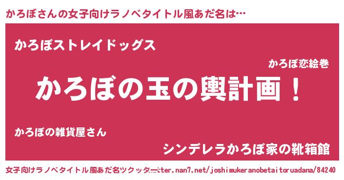 | 男性向けラノベタイトル風あだ名 | 『かろぼ~年齢イコール彼女いない歴の魔法使い~』 |
