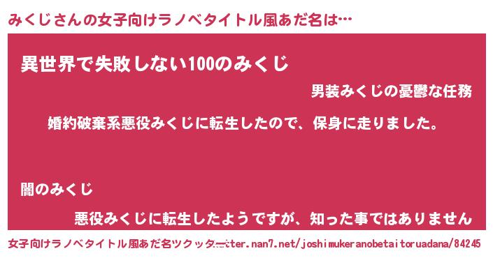| 胡散臭い通販商品みたいなあだ名 | 『絶対に幸福をもたらす健康食品…その名も「みくじ」』 |