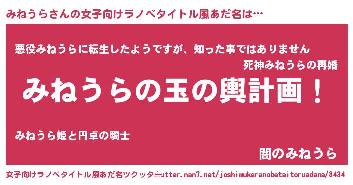 みねうらさんの女子向けラノベタイトル風あだ名は… 『みねうらの玉の輿計画!』『悪役みねうらに転生したようですが、知った事ではありません』『闇のみねうら』 ツクッター #女子向けラノベタイトル風あだ名ツクッター http://tkutter.nan7.net/joshimukeranobetaitoruadana/8434/