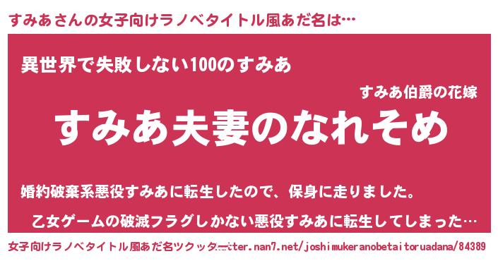 | 男性向けラノベタイトル風あだ名 | 『おまえをオタクにしてやるから、俺をすみあにしてくれ! 』 |