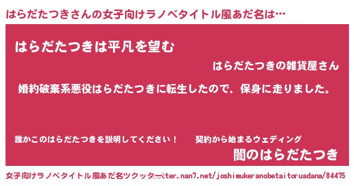 | 胡散臭い通販商品みたいなあだ名 | 『信頼と実績のサプリメント…その名も「はらだたつき」』 |