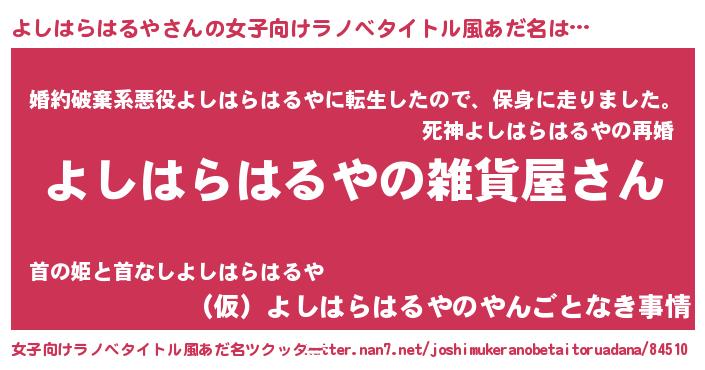 | 男性向けラノベタイトル風あだ名 | 『やはりよしはらはるやの青春ラブコメはまちがっている 』 |