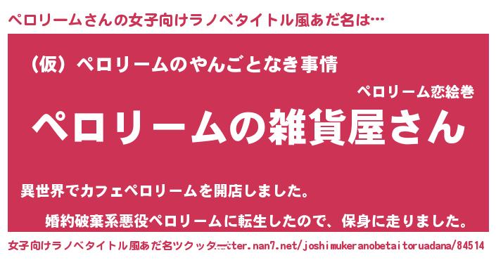 ペロリームさんの女子向けラノベタイトル風あだ名は… 『ペロリームの雑貨屋さん』『(仮)ペロリームのやんごとなき事情』『婚約破棄系悪役ペロリームに転生したので、保身に走りました。』 ツクッター #女子向けラノベタイトル風あだ名ツクッター http://tkutter.nan7.net/joshimukeranobetaitoruadana/84514/